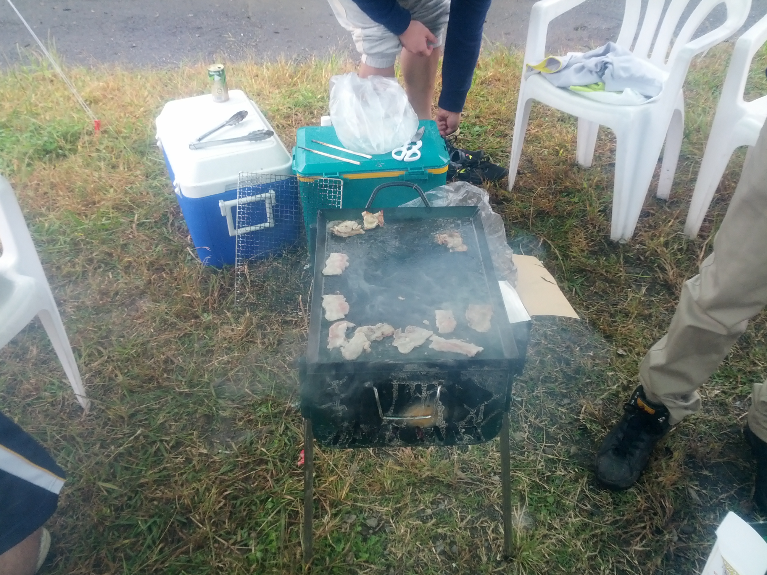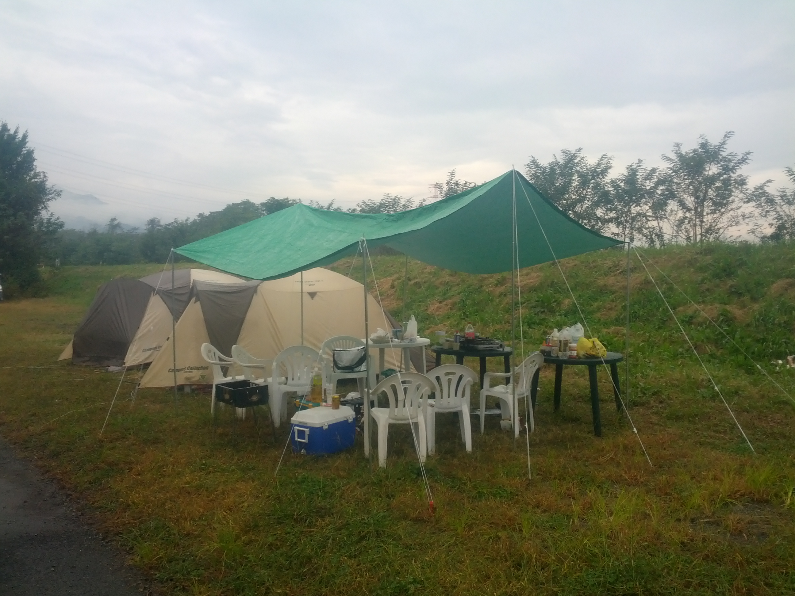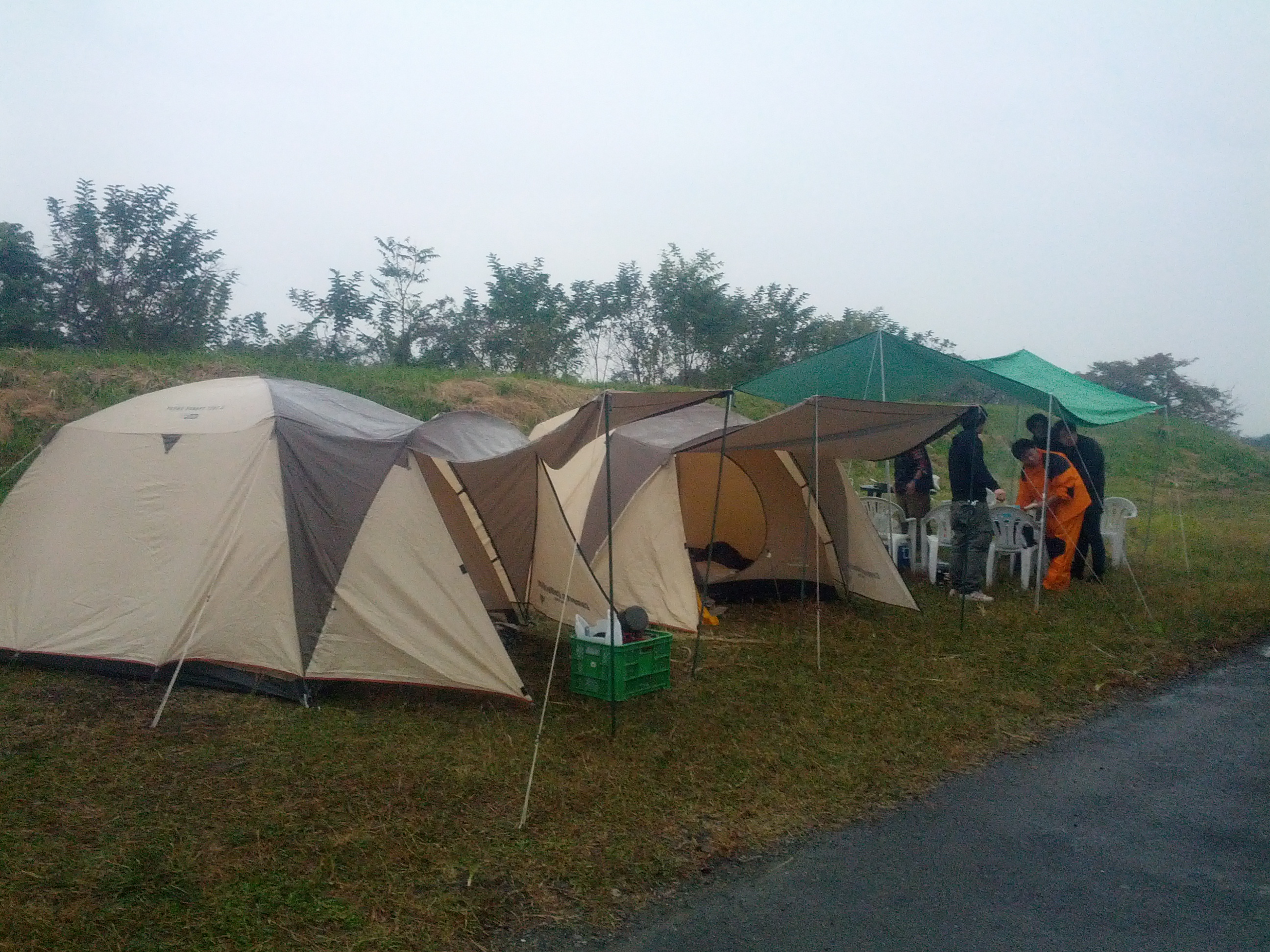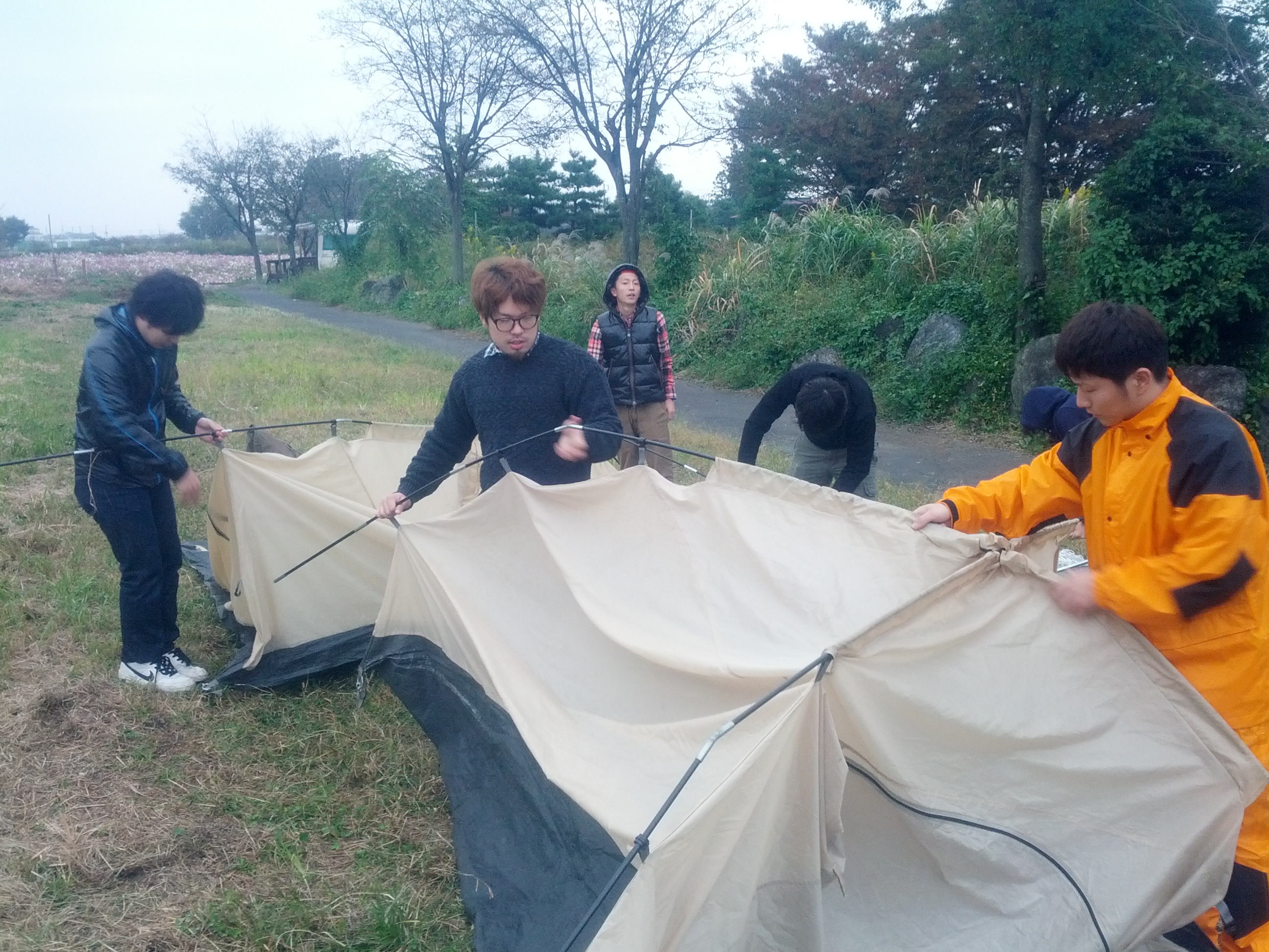 あいにくの天気で雨の降る中でのテントの設営でしたが